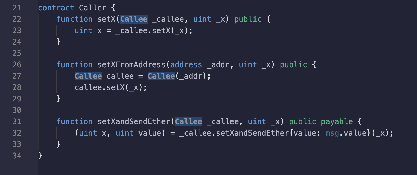 - Caller에서 SetX(), setXFromAddress(), setXandSendEther() 함수 정의 후 사용하기.