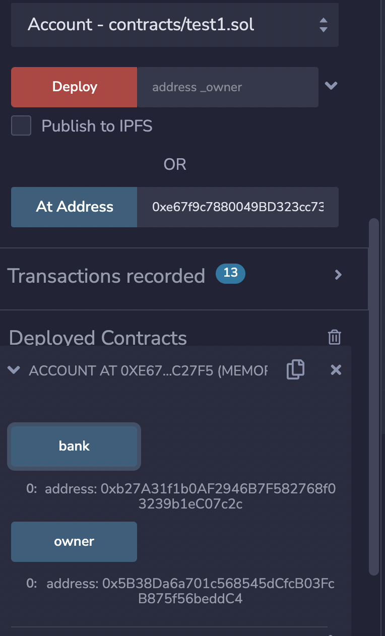 - Account 컨트랙트 선택후, At address에 해당 컨트랙트 주소 입력