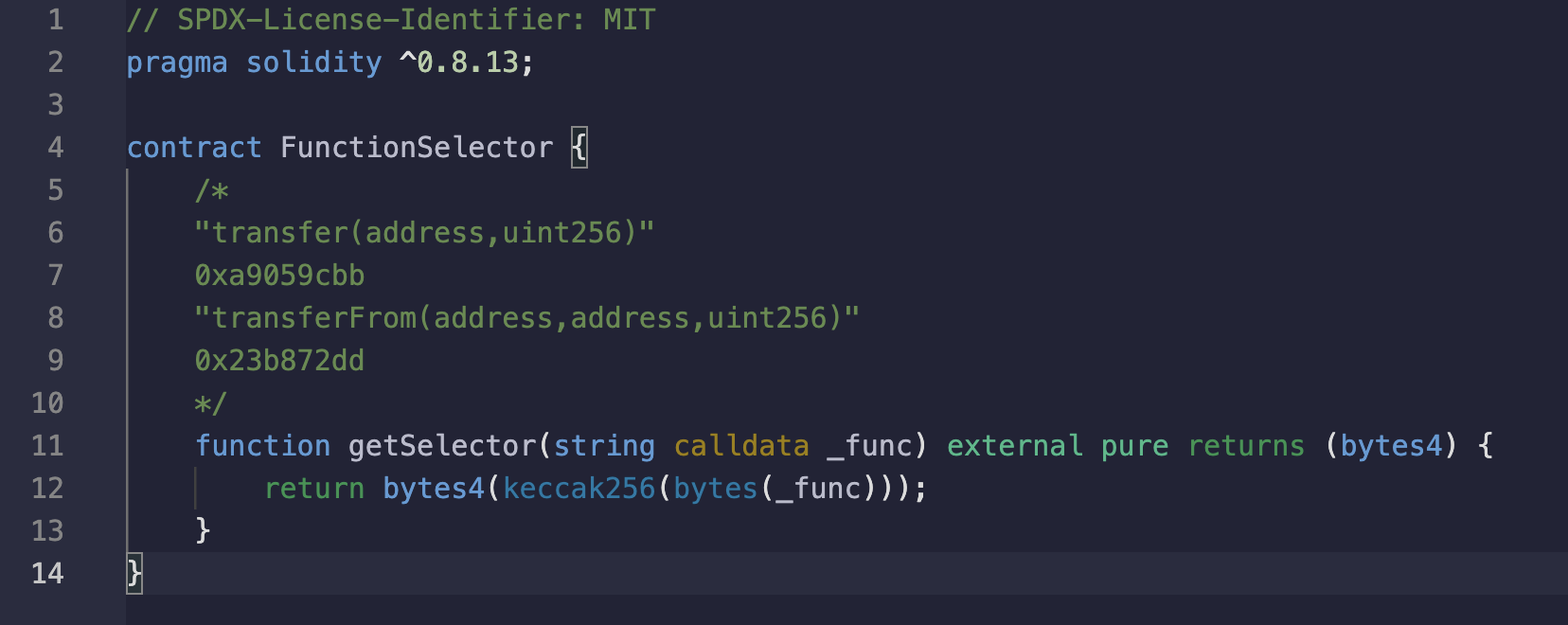 function getSelector(string calldata _func) external pure returns (bytes4) {