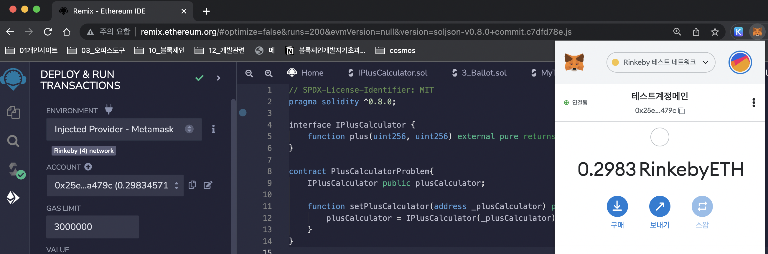 1) 리믹스 Deploy&Run에서 메타마스크 연결 후 RinkebyETH 계정으로 연결