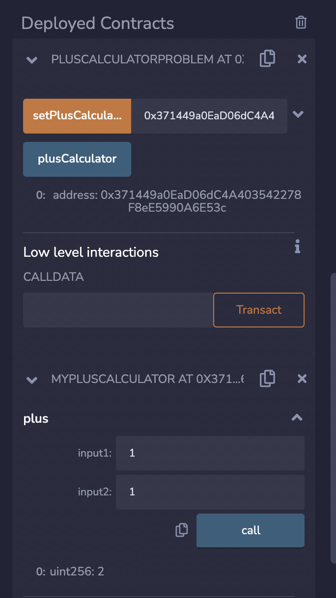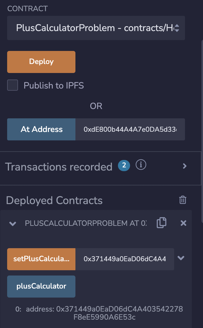 - PlusCalculatorProblem을 선택하고 At Address에 오른쪽 창에 문제를 클릭했을때 생성된 컨트랙트 주소를 넣고 At Address를 눌러줍니다. 그럼 아래에 PLUSCALCULATORPROBLEM이라는 컨트랙트가 생성되면서 해당 컨트랙트의 함수에 접근할 수가 있습니다.