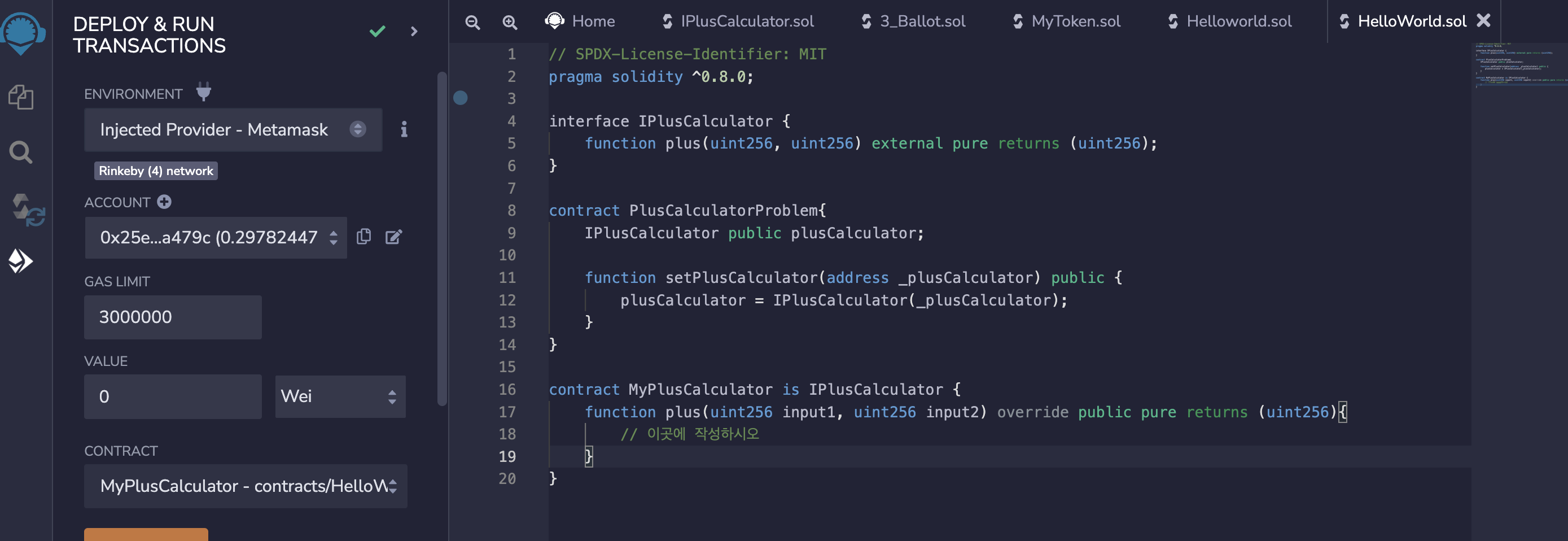 - setPlusCalculator에 MyPlusCalculator 컨트랙트를 deploy한 후에 생성된 주소를 넣어줍니다.