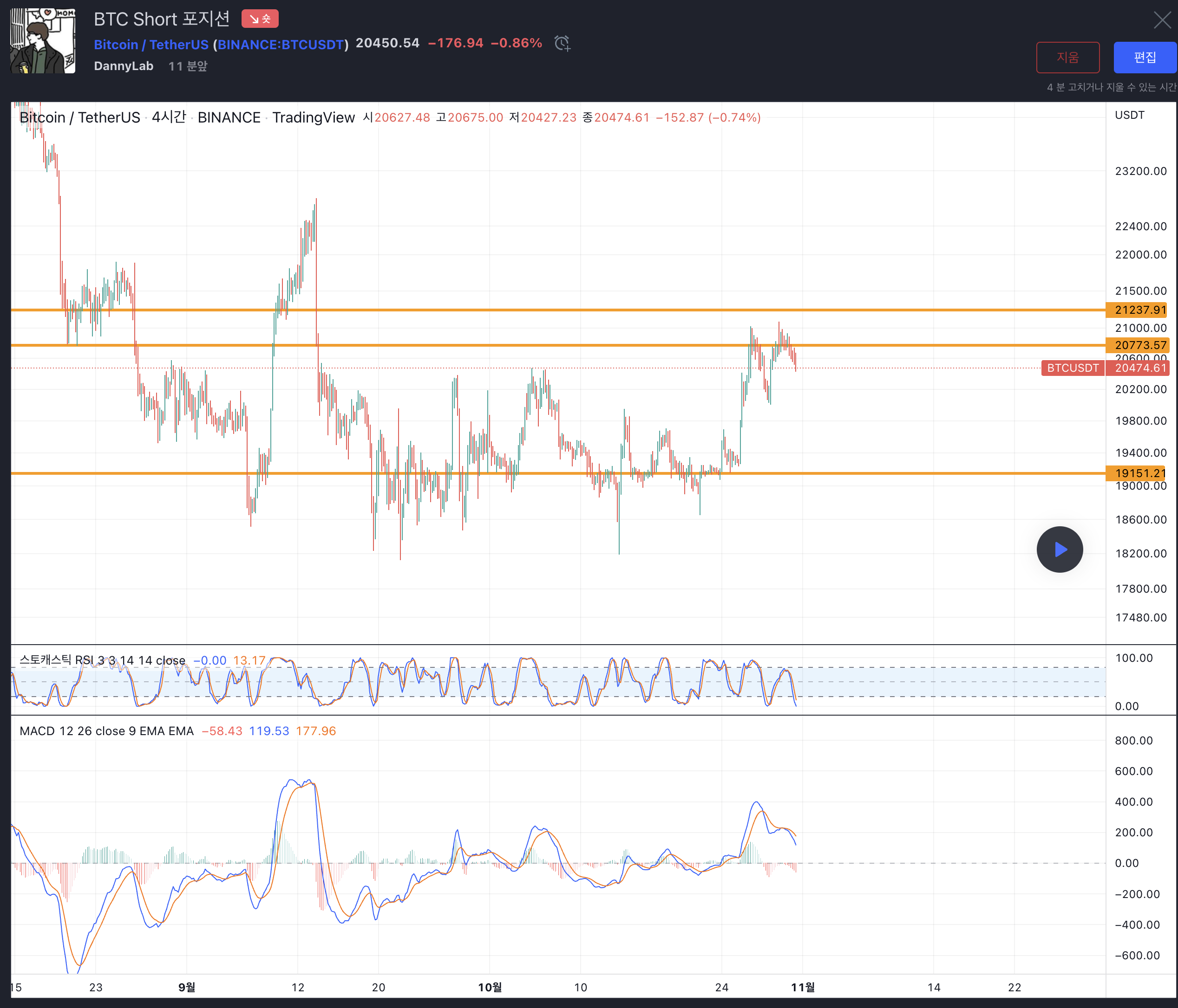 - Short 포지션 진입가 : 20,773, SL : 20773, TP : 19151