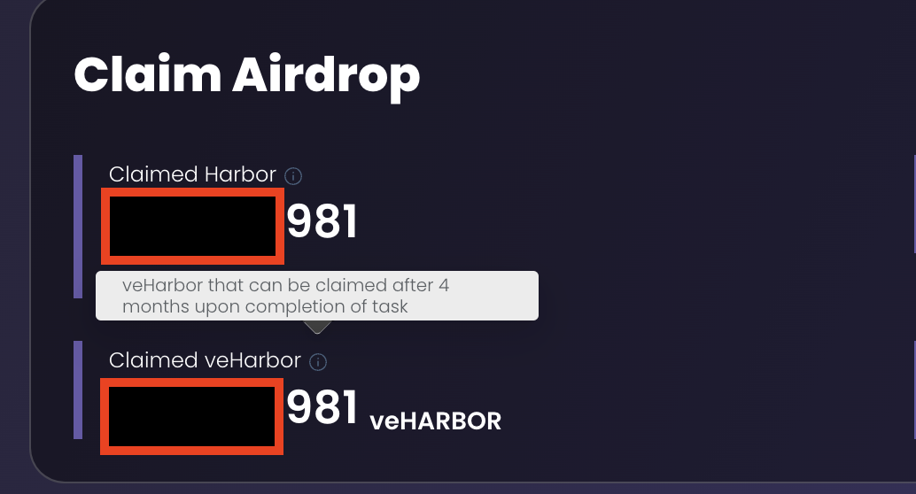 에어드랍 미션은 4개월 lock이 있는듯 합니다. veHarbor로 수량이 표시되어 있네요.