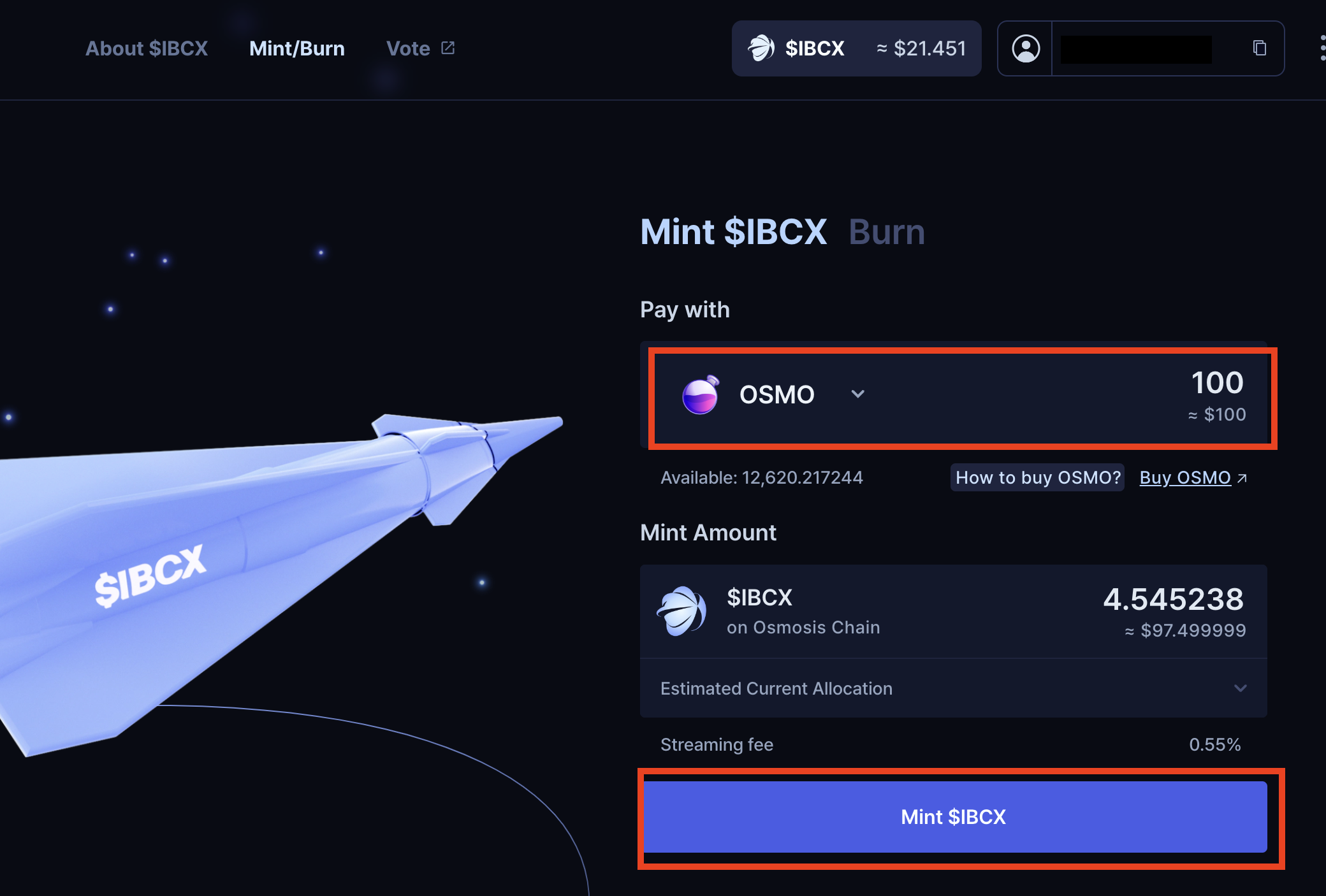 4.1 민팅 - 테스트로 받은 OSMO를 IBCX로 민팅합니다. 전부하지 말고 반정도 합니다.