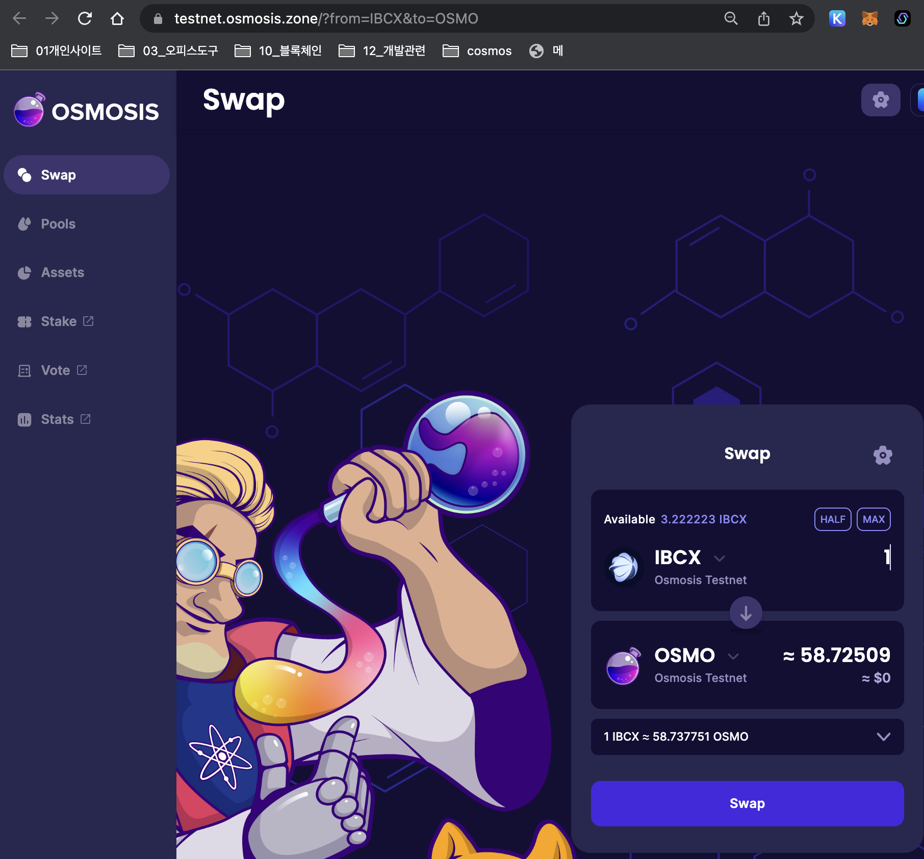 오스모시스 IBCX, OSMO Swap 테스트 사이트(아래 링크)