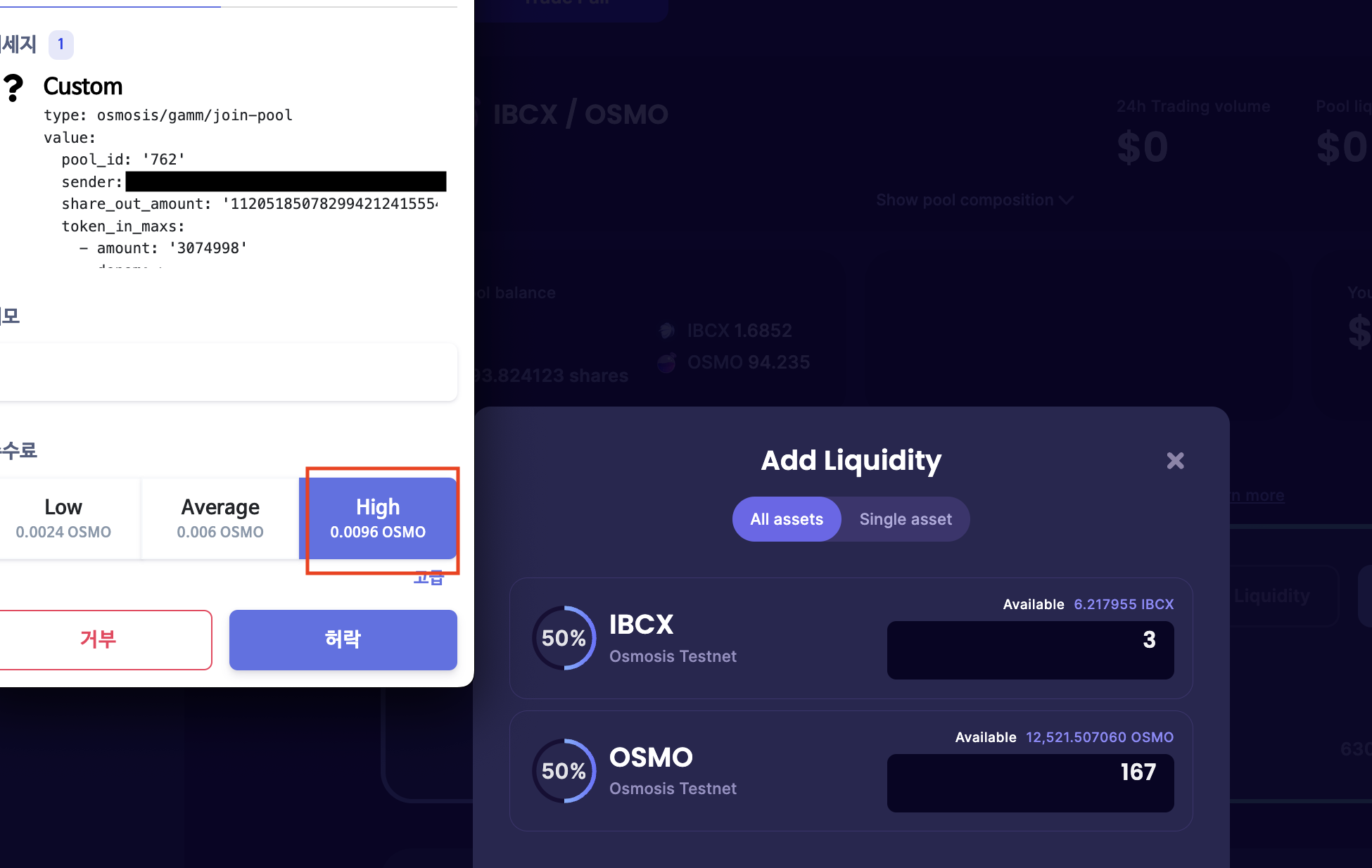 -접속해서 아래와 같이 IBCX를 OSMO로 교환하면 됩니다.(이때도 가스비 최고로)\