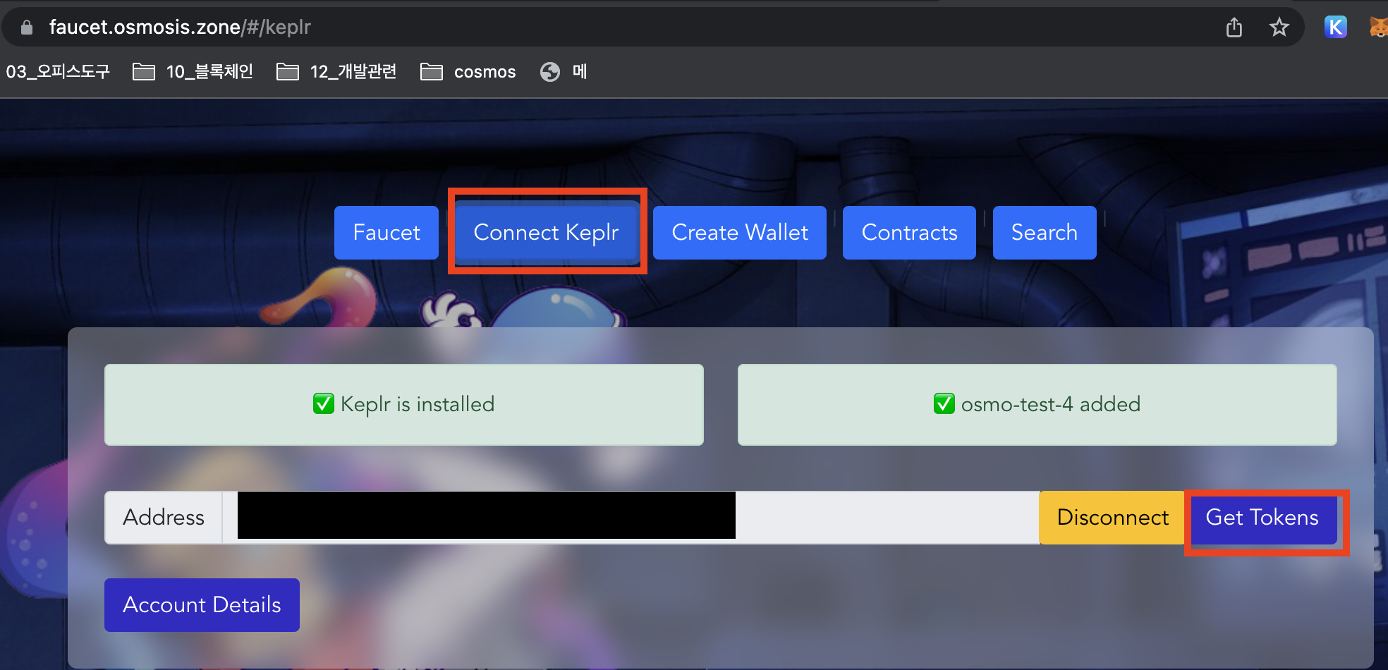 3.2 Connect Keplr 클릭 - Get Tokens 클릭하면 자신의 OSMO 주소로 테스트 토큰을 받게 됩니다.