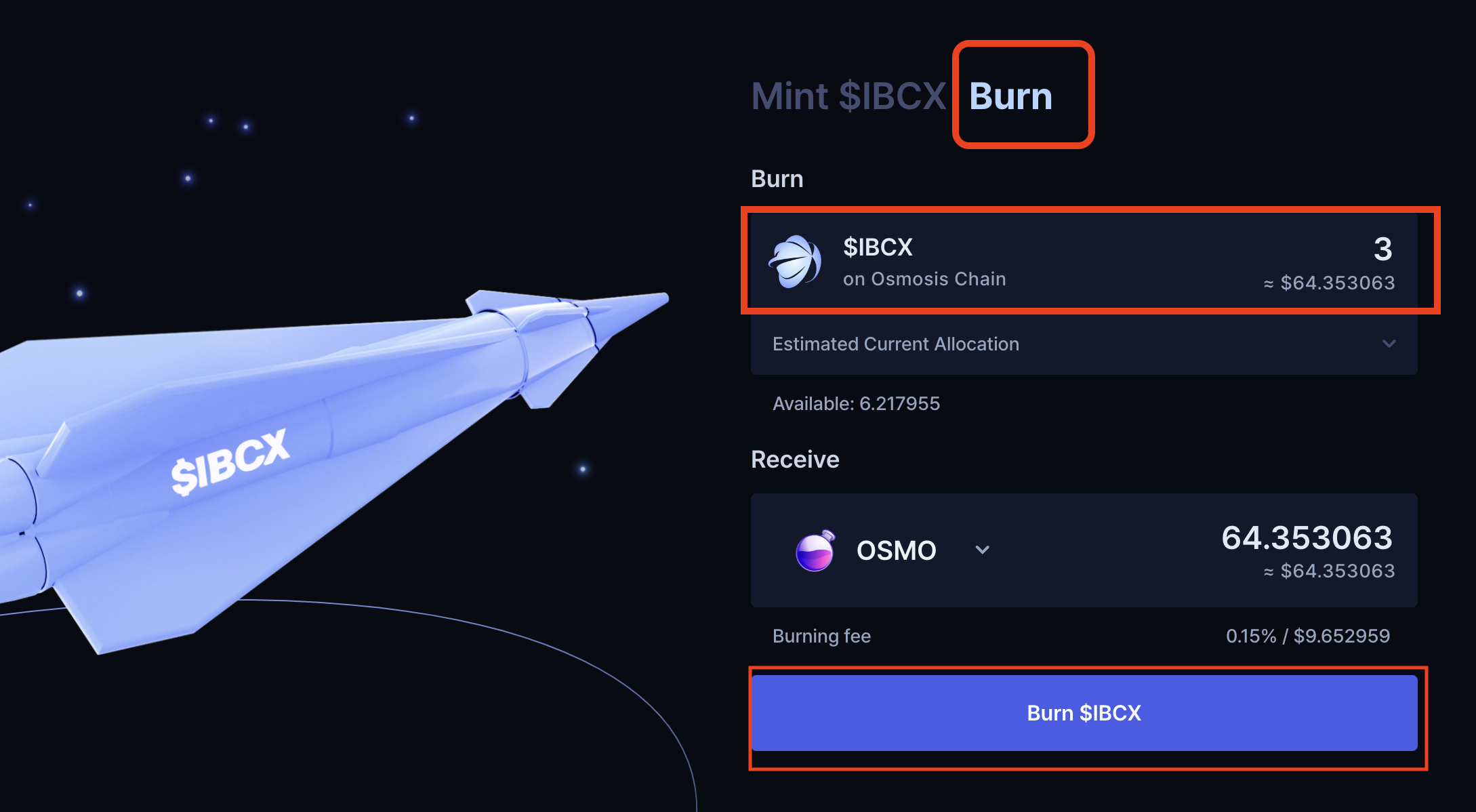 4.2 소각(Burn) - IBCX를 Burn 합니다. 그럼 오스모로 교환이 됩니다. (메뉴가 Mint 오른쪽에 Burn 요거 누르시면 되요)