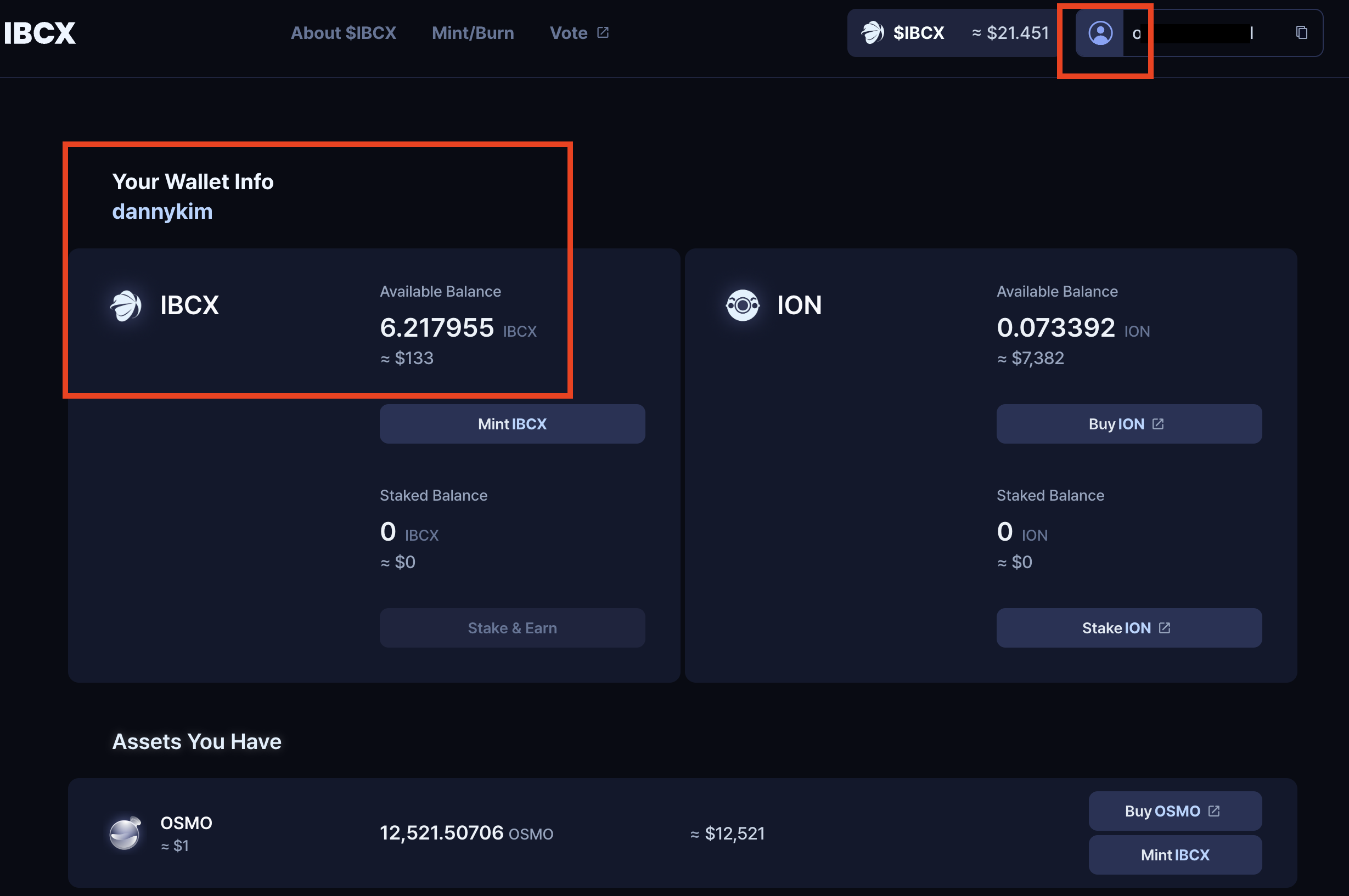 4.2 소각(Burn) - IBCX를 Burn 합니다. 그럼 오스모로 교환이 됩니다. (메뉴가 Mint 오른쪽에 Burn 요거 누르시면 되요)