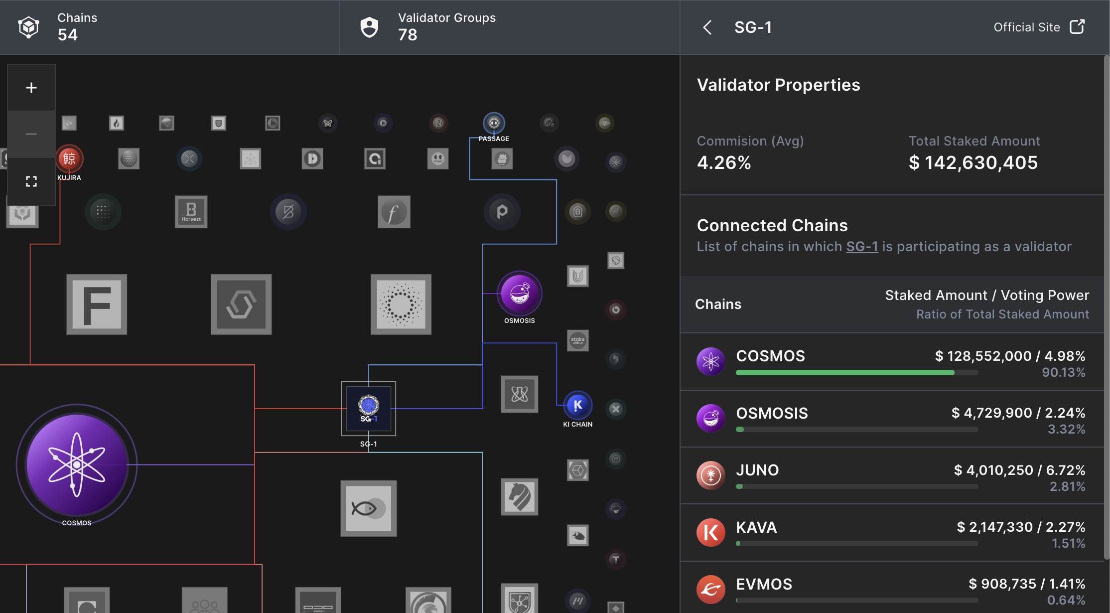 코스모스 생태계에서 포트폴리오 구성하실 때 참고하실 수 있도록 상위 검증인 10의 스테이킹된 비율 및 금액에 대해서 정리했습니다.