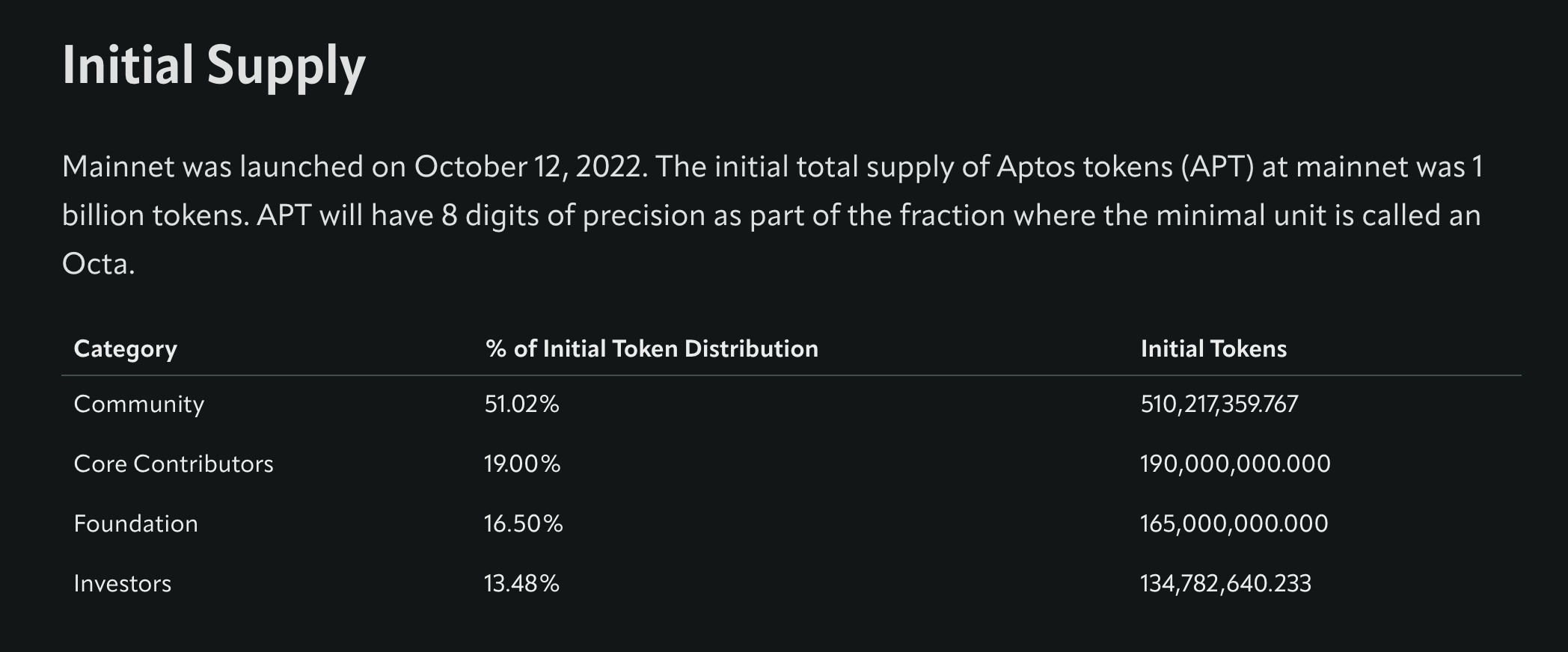- Aptos 토큰이코노미는 커뮤니티 51%, 코어개발팀 19%, 파운데이션 16.5%, 투자자 13.48%다.
