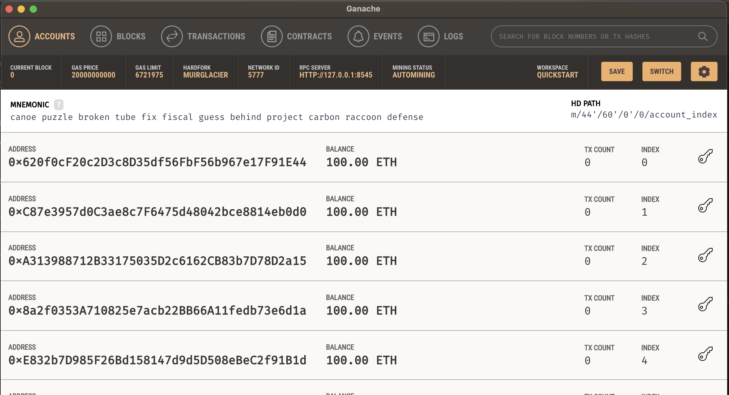 Features VISUAL MNEMONIC & ACCOUNT INFO Quickly see the current status of all accounts, including their addresses, private keys, transactions and balances.