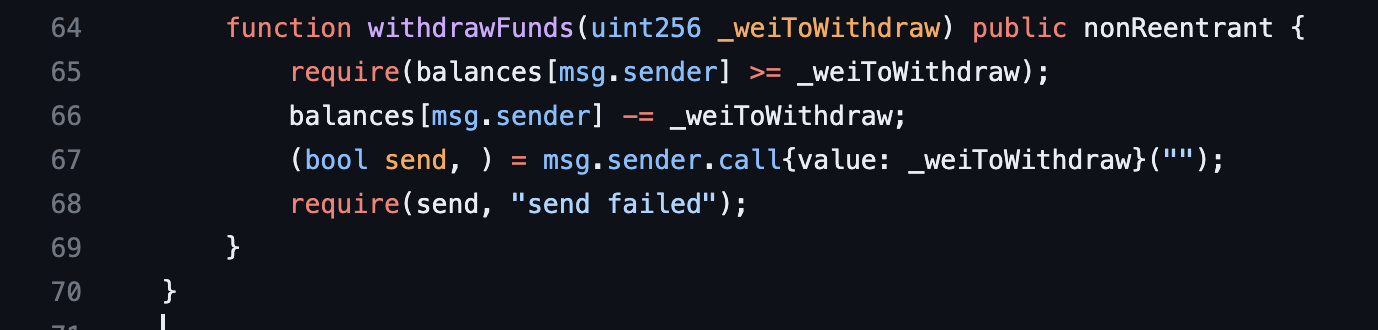 이로 인해 공격자의 계약은 잔액 업데이트 이전에 withdrawfunds 함수로 재진입 호출을 수행할 수 있음.
