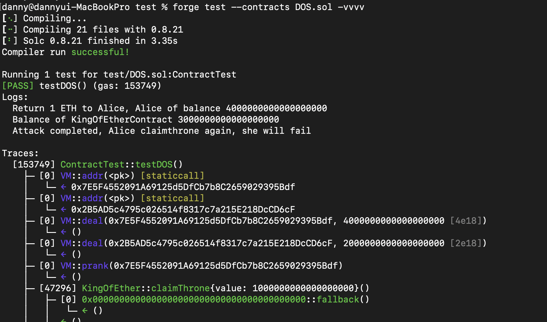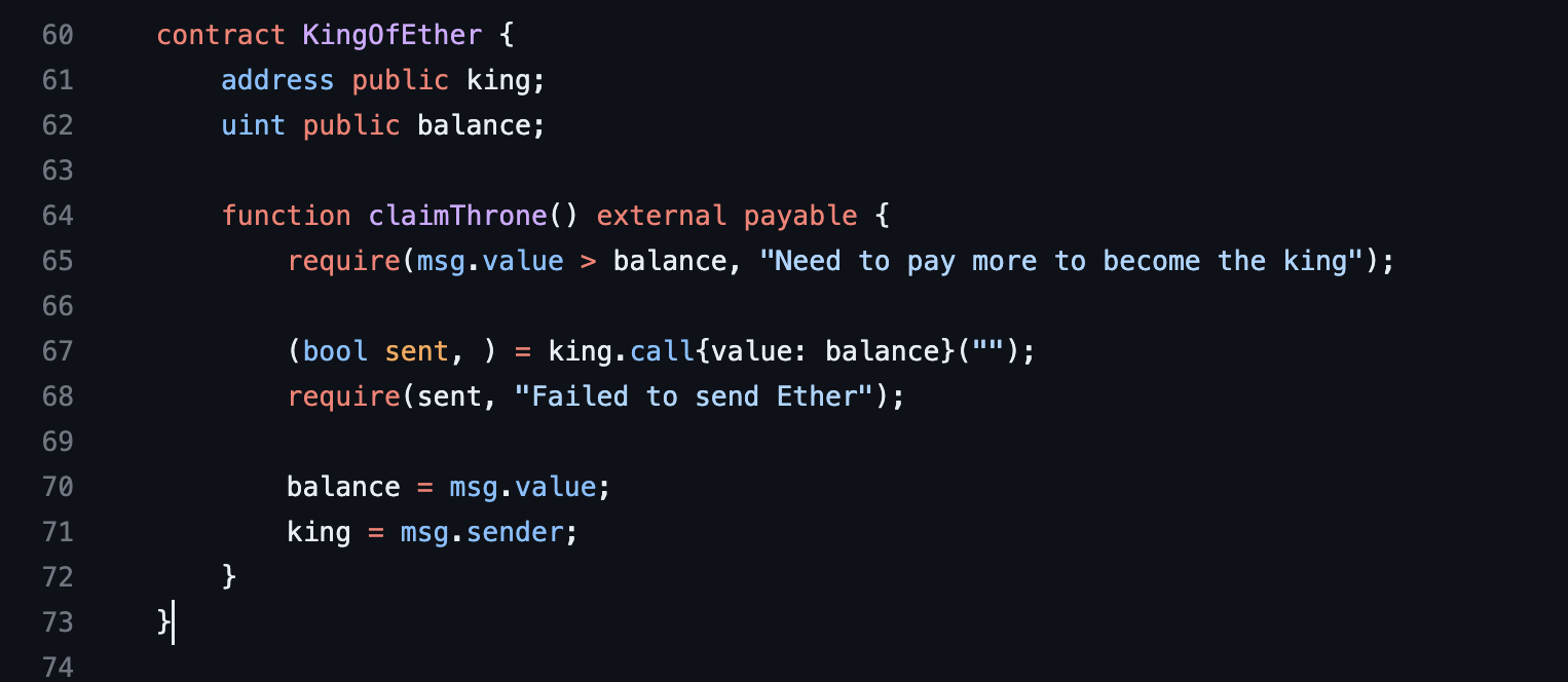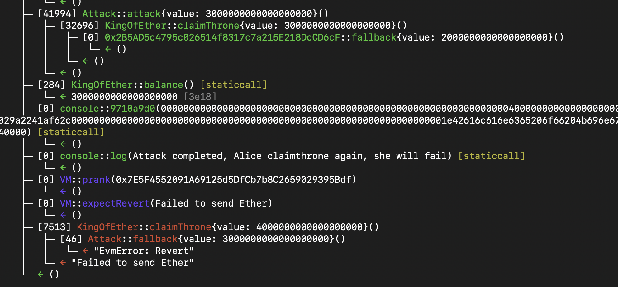 공격자의 계약은 왕이 되어서 후속 fallback 함수를 실패시키거나 정해진 가스 한도보다 더 많은 가스를 소비하여 KingOfEther 계약이 이전 왕에게 이더를 반환하려고 할때 claimThrone 함수를 실패하게 만들 수 있음