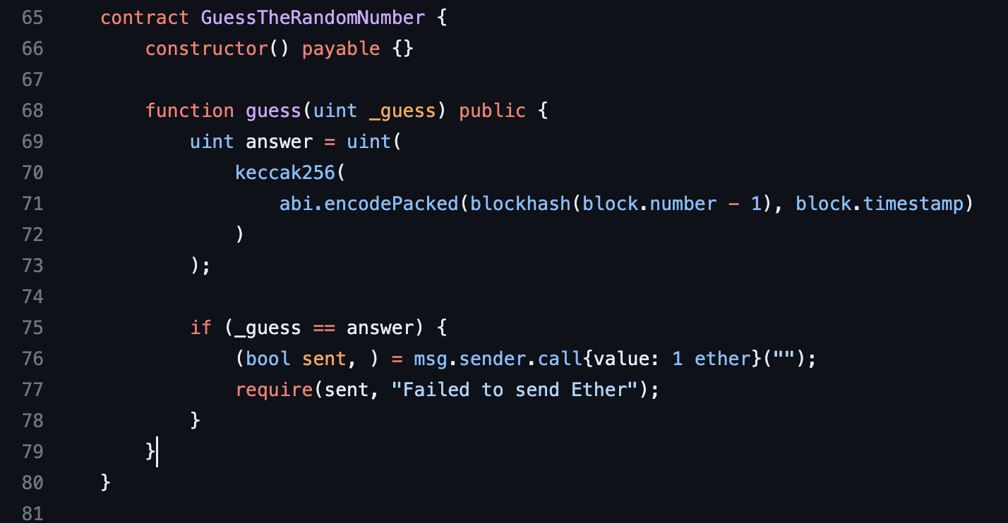 GuessTheRandomNumber는 블록해시와 타임스탬프에서 생성된 유사한 무작위 숫자를 맞춘다면 1 이더를 얻을 수 있는 게임