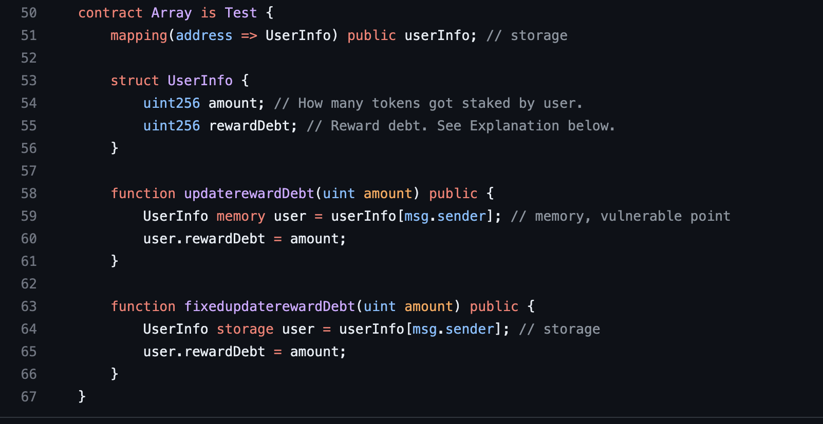 https://github.com/SunWeb3Sec/DeFiVulnLabs/blob/main/src/test/DataLocation.sol