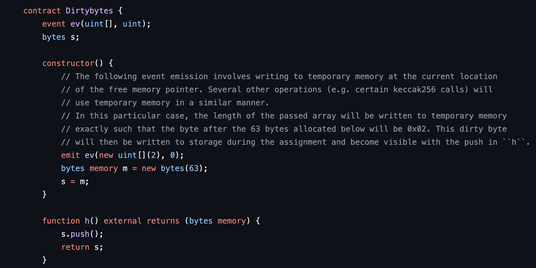 이런 dirty bytes는 storage의 ‘bytes’ 배열에 ‘.push()’를 인자 없이 수행한 후에 관찰 가능해질 수 있음