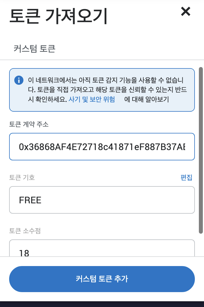 - 위 컨트랙트 주소를 메타마스크 지갑에서 가져오기 합니다.