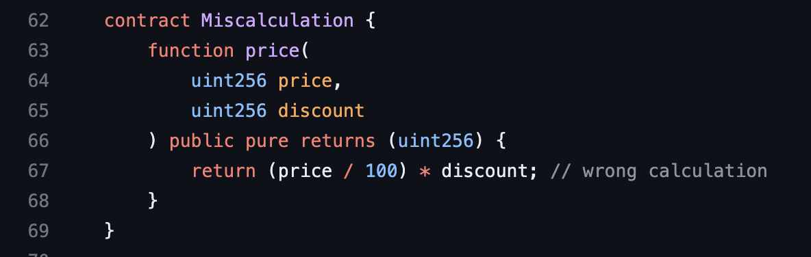 “Miscalculation” 계약에서 함수 price는 나눗셈을 곱하기보다 먼저 수행함(price/100)*discount