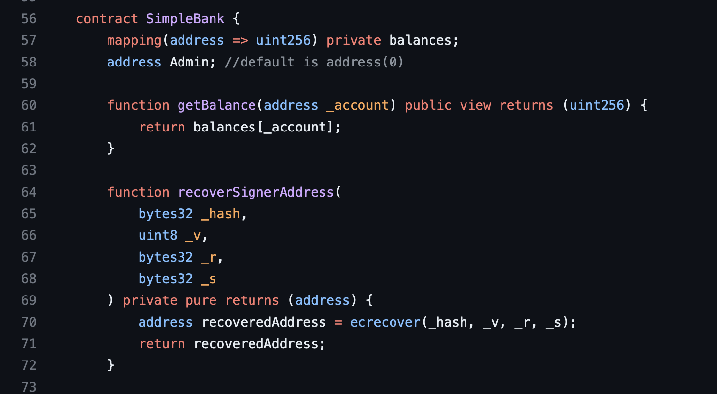 SimpleBank 계약에서 transfer 함수는 매시지 해시와 서명(v,r,s 값)을 입력으로 받음.