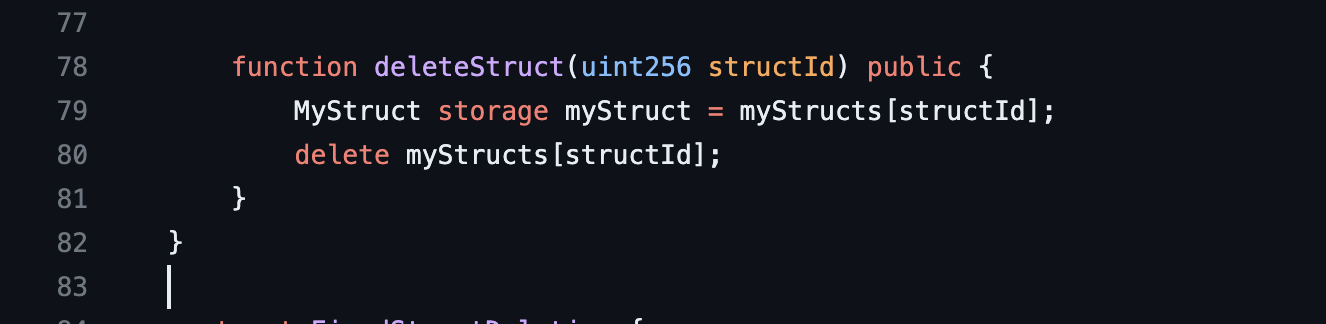 Delete myStructs[structId]가 호출되면 이는 매핑 내의 id 만 기본값인 0으로 재설정하지만, 매핑 내의 다른 플래그는 변경되지 않음. 따라서 구조체 내부의 매핑을 삭제하지 않고 구조체를 삭제하면 남아 있는 플래그라 스토리지에 계속 남게 됨.