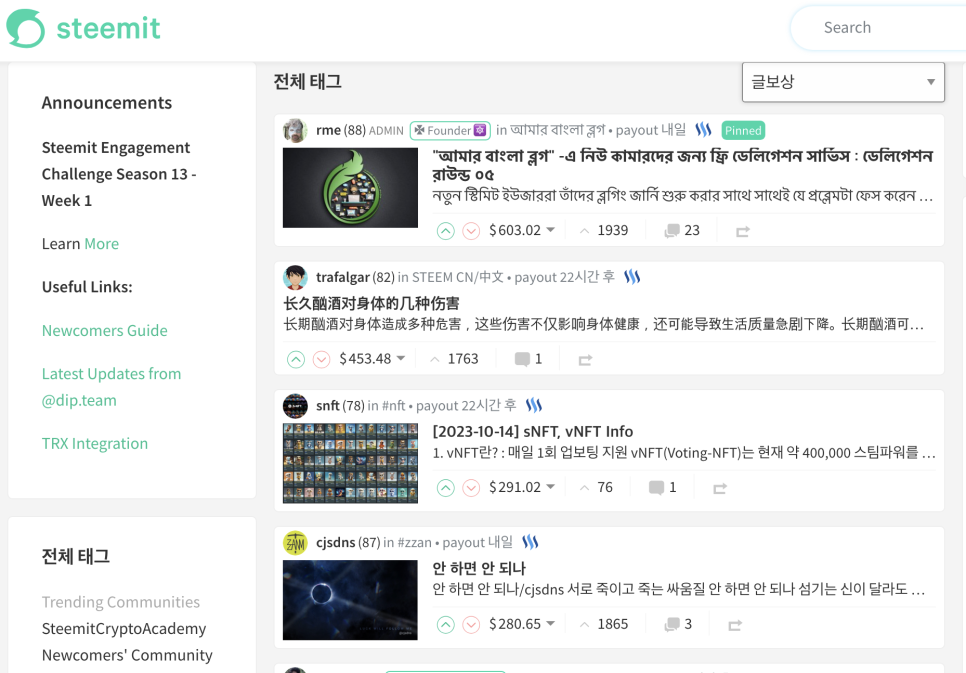구지 5년전으로 돌아갈 필요는 없다. 그 당시 처음 접했던 글 하나에 200,300달러의 가치를 보여주는 블록체인 기반의 SNS 서비스인 스팀잇이라는 서비스는 현재도 존재하고 여전히 매니아층에서 활용되고 있다. 시총도 100위권 안이니 그래도 망한 프로젝트는 아니고 여전히 호흡중인 프로젝트다. (사람들의 관심은 많이 사라졌다.)