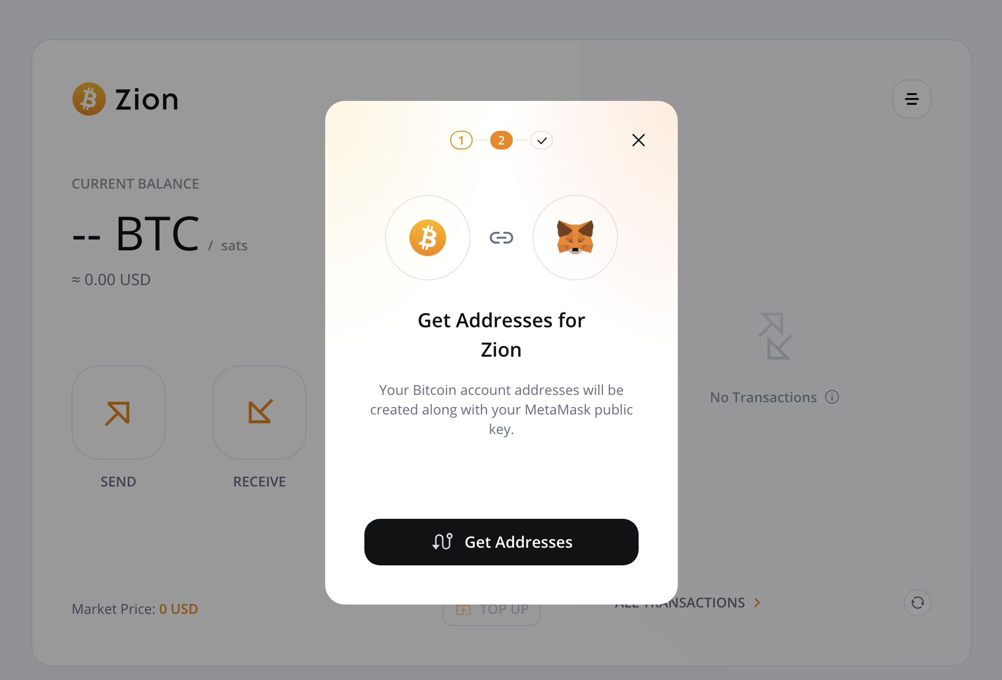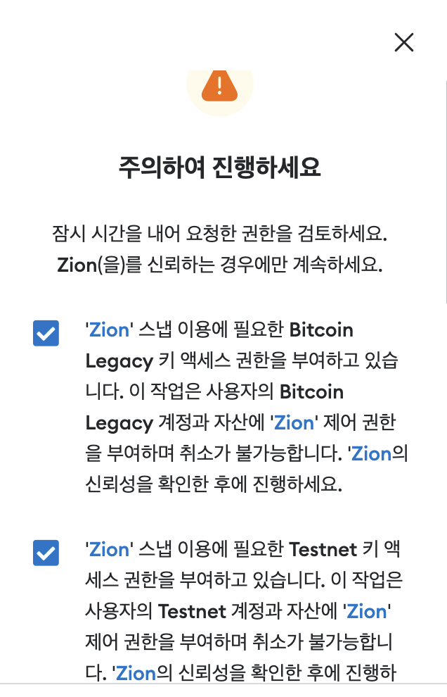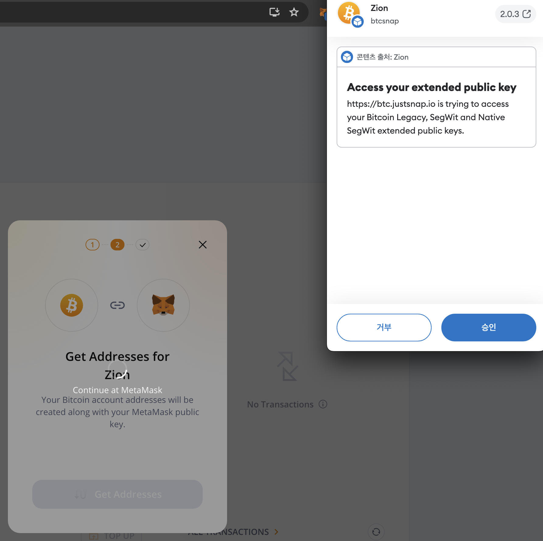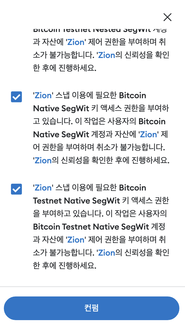 - 메타마스크의 프라이빗키를 확인해서 3rd party인 Zion 웹사이트에서 비트코인을 받고, 보낼 수 있도록 해주는 기능이다.