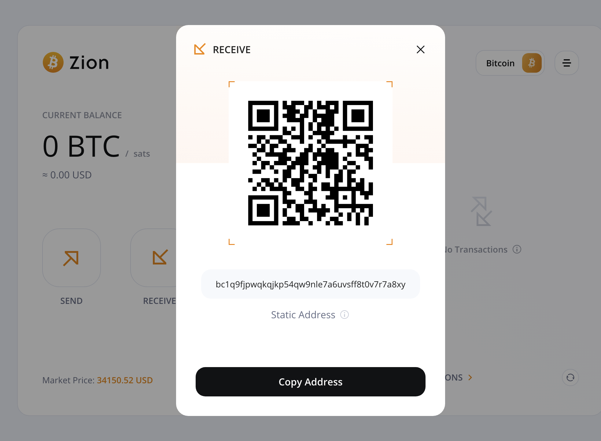 - Receive 를 클릭하면 BTC 주소를 확인 가능하다.