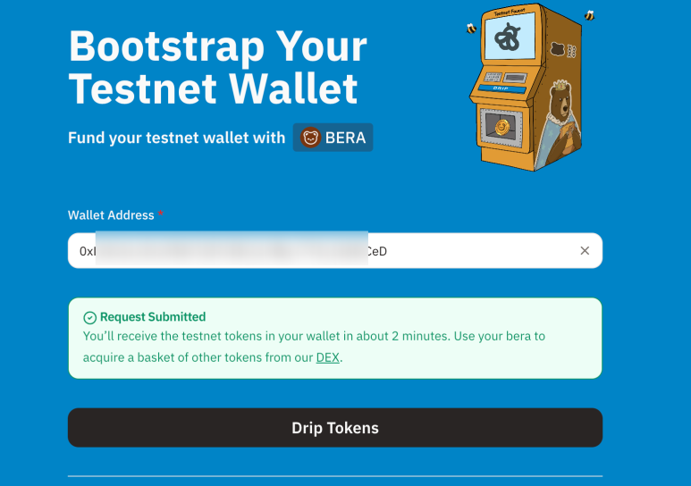 2. Faucet에서 bera 테스트넷 토큰 받기(8시간마다 받을 수 있음)
