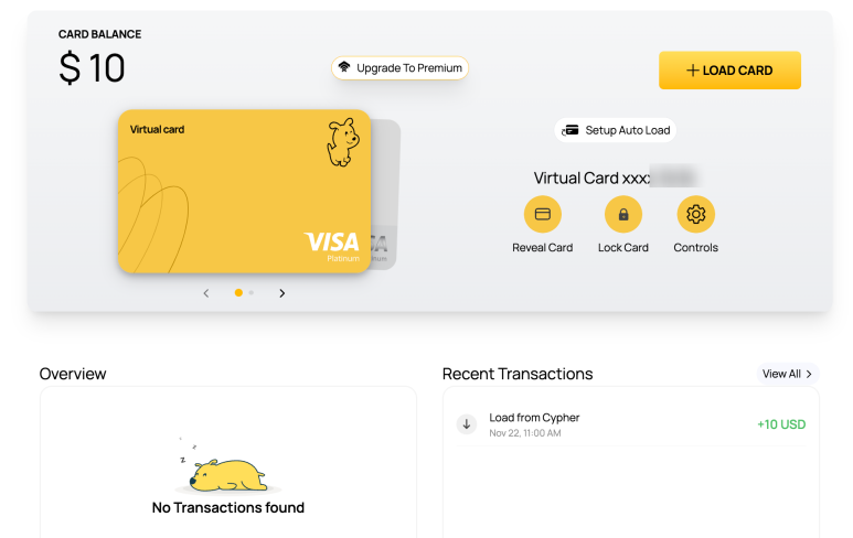 그래서 일단 카드를 발급해봤습니다. 2가지 종류가 있는데 바이비트 거래소 카드(이게 가장 심플)와 개인지갑 연결해서 사용하는 Cypher이 있습니다.