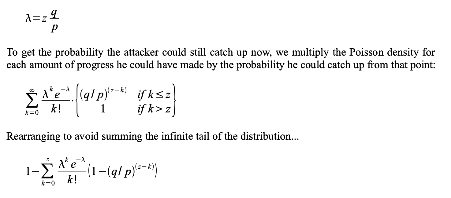 The recipient waits until the transaction has been added to a block and z blocks have been linked after it. He doesn't know the exact amount of progress the attacker has made, but assuming the honest blocks took the average expected time per block, the attacker's potential progress will be a Poisson distribution with expected value: