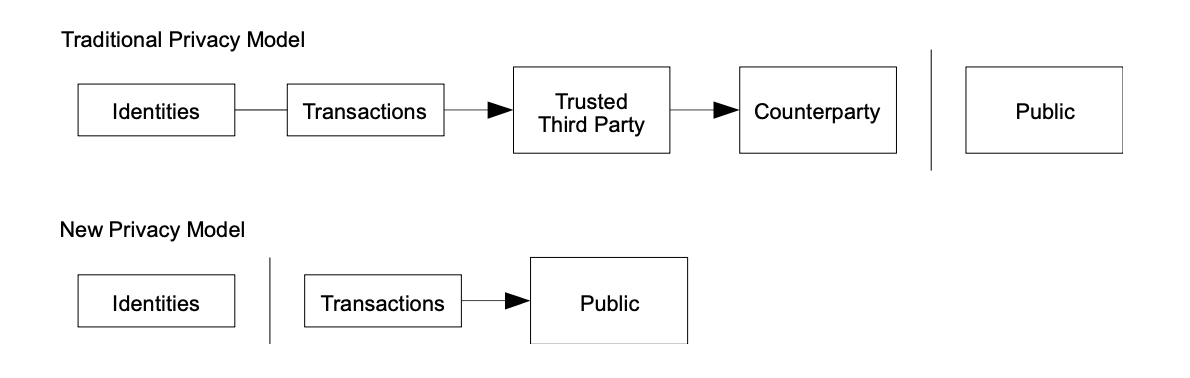 The traditional banking model achieves a level of privacy by limiting access to information to the parties involved and the trusted third party. The necessity to announce all transactions publicly precludes this method, but privacy can still be maintained by breaking the flow of information in another place: by keeping public keys anonymous. The public can see that someone is sending an amount to someone else, but without information linking the transaction to anyone. This is similar to the level of information released by stock exchanges, where the time and size of individual trades, the "tape", is made public, but without telling who the parties were.