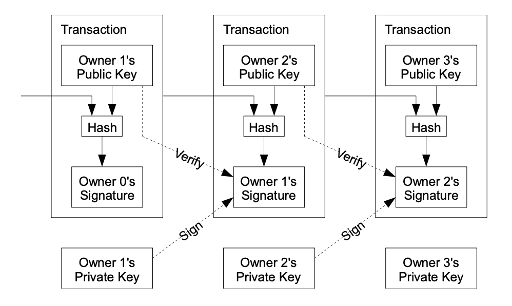 We define an electronic coin as a chain of digital signatures. Each owner transfers the coin to the next by digitally signing a hash of the previous transaction and the public key of the next owner and adding these to the end of the coin. A payee can verify the signatures to verify the chain of ownership.