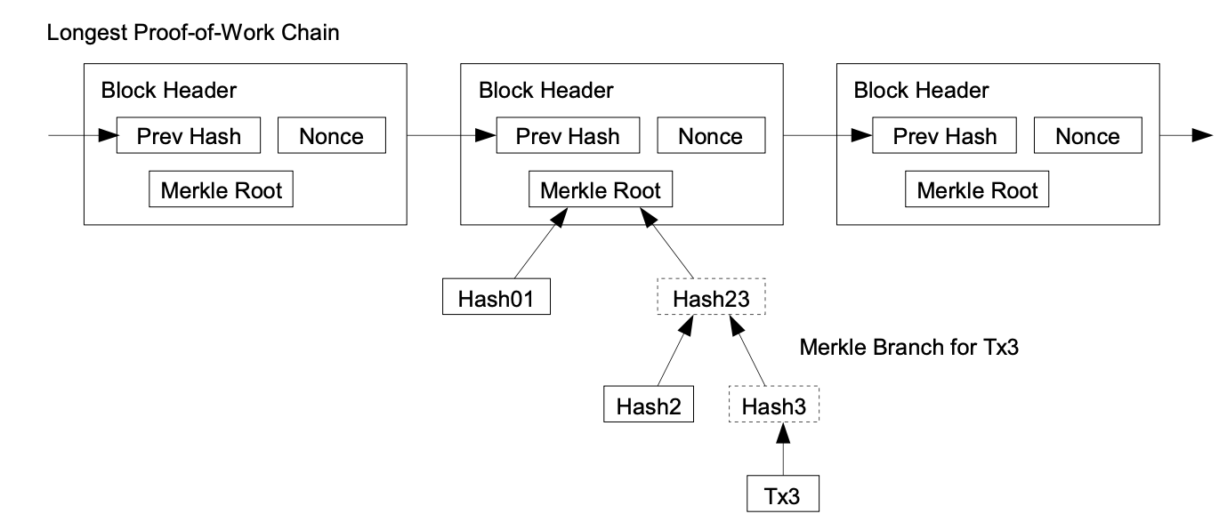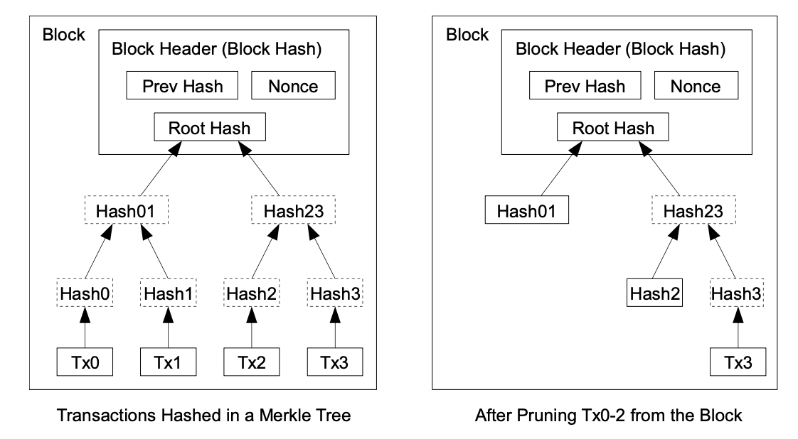 Once the latest transaction in a coin is buried under enough blocks, the spent transactions before it can be discarded to save disk space. To facilitate this without breaking the block's hash, transactions are hashed in a Merkle Tree [7][2][5], with only the root included in the block's hash. Old blocks can then be compacted by stubbing off branches of the tree. The interior hashes do not need to be stored.