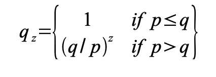 qz = probability the attacker will ever catch up from z blocks behind